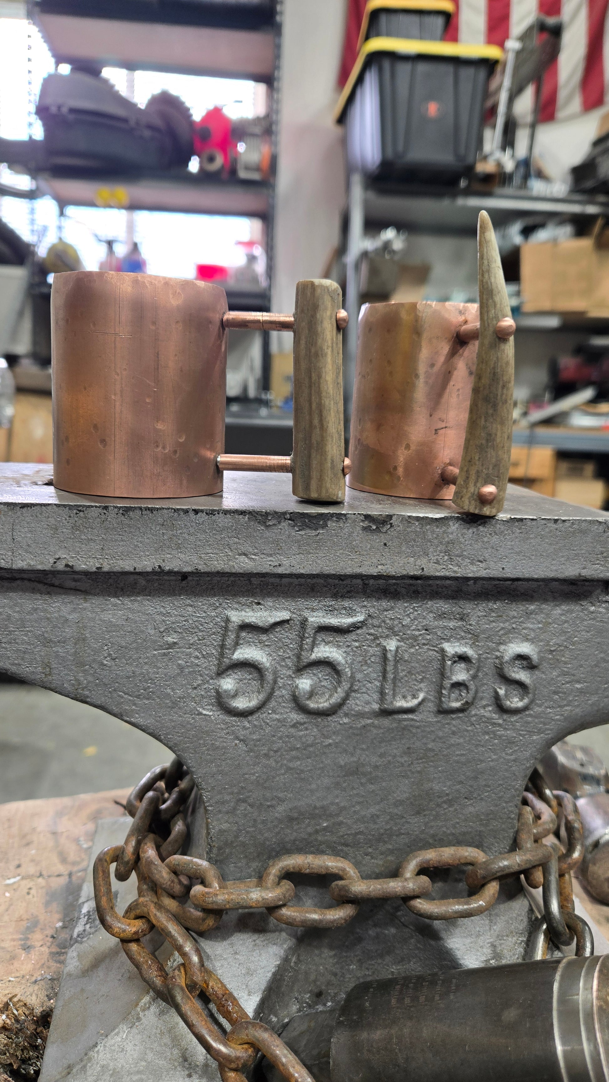 Each 2" diameter copper cup is hand crafted for your sipping pleasure. Each one is a one of a kind guaranteed! Freeze 3/8" of water in the bottom to keep your spirits chilled. These are made one at a time and soldered together with lead free solder. Please indicate silver spoon or antler style.